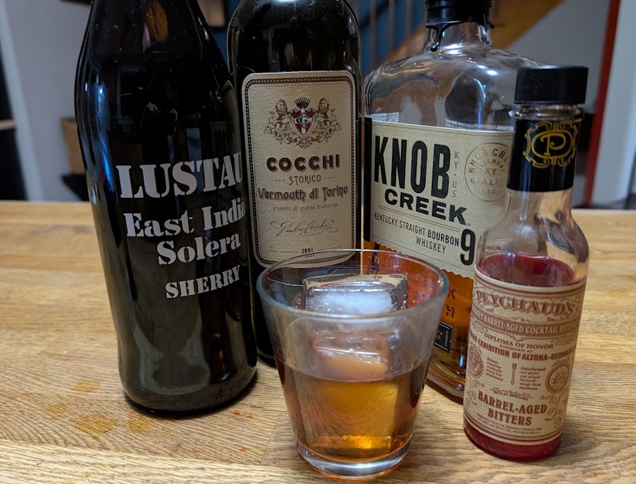 So for my creation instead of Campari, I reached for Lustau East India Solera Sherry. It adds a rich, nutty sweetness that plays perfectly with Knob Creek 9 Year Bourbon and Cocchi Vermouth di Torino. A couple dashes of Barrel-Aged Peychaud’s Bitters finish it off.